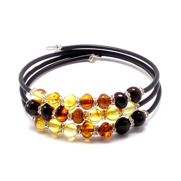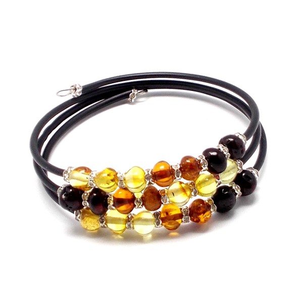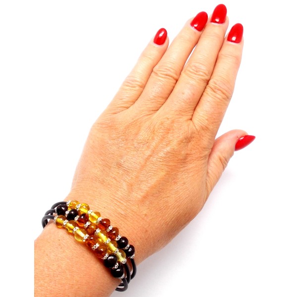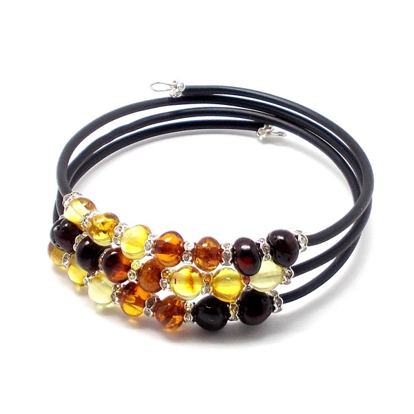 - Oryginalna, ręcznie wykonana bransoletka z bursztynu bałtyckiego, stali szlachetnej z cyrkoniami. Do każdego wyrobu dołączony jest certyfikat. Bransoletka wykonana na drucie pamięciowym, bez zapięcia, obwód 18–21 cm (dostosowuje się do nadgarstka), oplatana wokół nadgarstka. Średnica bursztynów 6-7 mm. Każdy wyrób wysyłany jest w eleganckim, firmowym opakowaniu. Oryginalny prezent na wyjątkowe okazje.