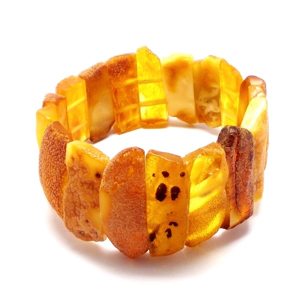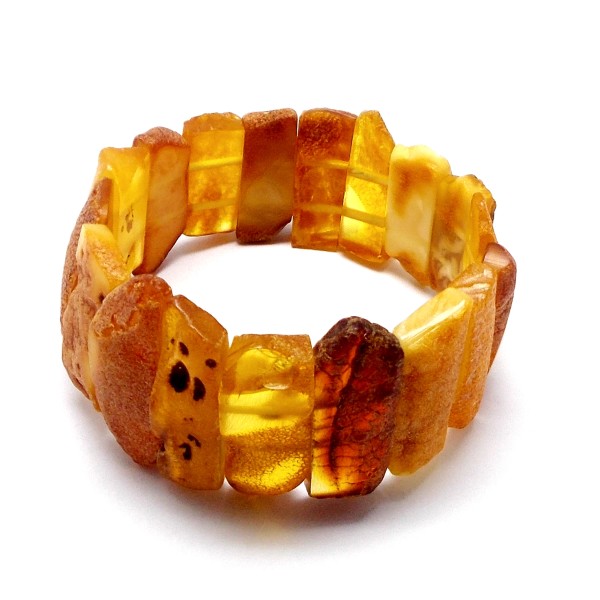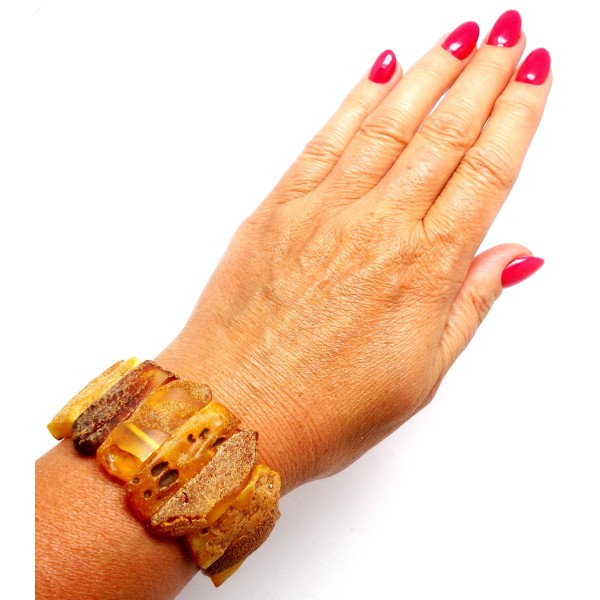 - Oryginalna, ręcznie wykonana bransoletka z bursztynów nieoszlifowanych (oszlifowane tylko spody bursztynów). To wyjątkowy i niepowtarzalny wyrób, który na pewno wzbudzi zainteresowanie swoim niepowtarzalnym stylem. Do każdej bransoletki dołączony jest certyfikat autentyczności, gwarantujący wysoką jakość wyrobu. Bransoletka ma wewnętrzny obwód (długość) 17,5 cm i jest bez zapięcia, wykonana na dwóch wzmocnionych gumkach. Bursztyny mają naturalne wżery, które podkreślają naturalność bursztynów i wysokość 23-38 mm, które tworzą imponujący i wyróżniający się element biżuterii. Cała bransoletka waży 29,60 g, co czyni ją nie tylko piękną, ale również wygodną w noszeniu. Ten wyjątkowy wyrób jest sprzedawany z dokładnie tymi bursztynami, które widać na zdjęciu, dzięki czemu możesz być pewien, że otrzymasz wyjątkowy, niepowtarzalny produkt. Każdy bursztyn w bransoletce jest unikatem. Każda bransoletka wysyłana jest w eleganckim, firmowym opakowaniu, co sprawia, że jest idealnym prezentem dla siebie lub dla bliskiej osoby.