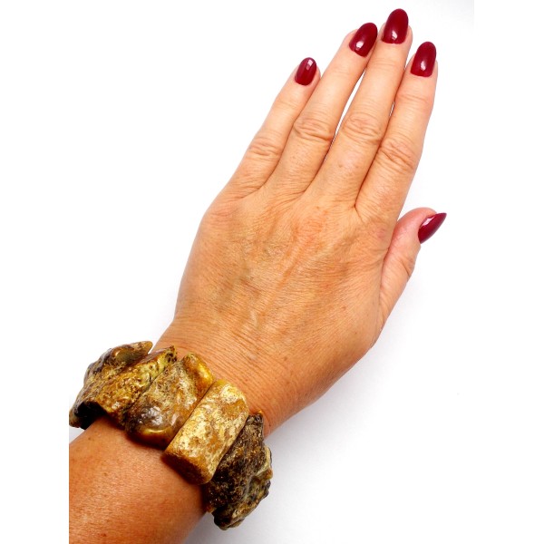 - Ręcznie wykonana, unikatowa bransoletka z bursztynu bałtyckiego, nieoszlifowanego (bursztyny są doszlifowane tylko do kształtu, posiadają dużą ilość naturalnych wżerów, co podkreśla ich naturalność). Do każdego wyrobu dołączony jest certyfikat. Wewnętrzny obwód bransoletki 19 cm, waga 48,60 g, wysokość bursztynów w bransoletce 30-35 mm. Sprzedaży podlega wyrób ze zdjęcia niepowtarzalny. Bransoletka bez zapięcia. Każdy wyrób wysyłany jest w eleganckim, firmowym opakowaniu. Oryginalny prezent na wyjątkowe okazje. Każdy bursztyn w bransoletce jest unikatem.