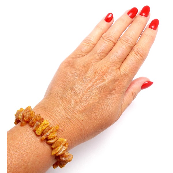 - Oryginalna, ręcznie wykonana bransoletka z bursztynu bałtyckiego, nieoszlifowanego. Do każdego wyrobu dołączany jest certyfikat. Wewnętrzny obwód 16-18 cm, szerokość bursztynów 10-19 mm, bez zapięcia wykonana na gumce. Każdy wyrób wysyłany jest w eleganckim, firmowym opakowaniu. Waga 15-17 g.