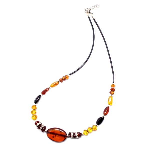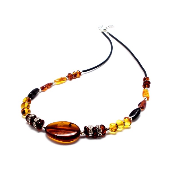 - Oryginalny, ręcznie wykonany naszyjnik z bursztynu bałtyckiego, oszlifowanego z elementami ze stali szlachetnej. Do każdego wyrobu dołączony jest certyfikat. Długość naszyjnika 42-45 cm (regulowana), waga 8,11 g, długość środkowego bursztynu 25 mm, szerokość 17 mm, bursztyny posiadają naturalne wżery, które podkreślają naturalność kamieni. Sprzedaży podlega wyrób ze zdjęcia, niepowtarzalny. Każdy wyrób wysyłany jest w eleganckim, firmowym opakowaniu.