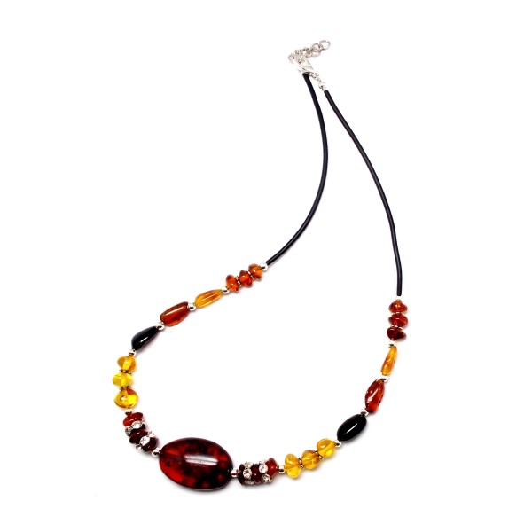 • Oryginalny, ręcznie wykonany naszyjnik z bursztynu bałtyckiego, oszlifowanego z elementami ze stali szlachetnej. Do każdego wyrobu dołączony jest certyfikat. Długość naszyjnika 41-44 cm (regulowana), waga 8,73 g, długość środkowego bursztynu 27 mm, szerokość 18 mm, bursztyny posiadają naturalne wżery, które podkreślają naturalność kamieni.  Sprzedaży podlega wyrób ze zdjęcia, niepowtarzalny. Każdy wyrób wysyłany jest w eleganckim, firmowym opakowaniu.