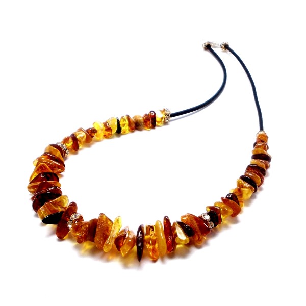 - Oryginalny naszyjnik ręcznie wykonany z bursztynu bałtyckiego, oszlifowanego z elementami ze stali szlachetnej, to wyjątkowy i niepowtarzalny wyrób, który na pewno wzbudzi zainteresowanie swoim niepowtarzalnym stylem. Do każdego naszyjnika dołączony jest certyfikat autentyczności gwarantujący wysoką jakość wyrobu. Naszyjnik ma długość 45-50 cm, która jest regulowana, szerokość bursztynów w naszyjniku to 5-15 mm. Każdy wyrób wysyłany jest w eleganckim, firmowym opakowaniu. Bursztyny mogą posiadać naturalne wżery, które podkreślają ich naturalność.