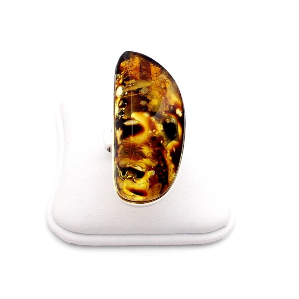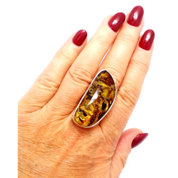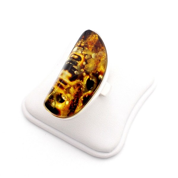 • Oryginalny, ręcznie wykonany pierścionek ze srebra próby 925 i bursztynu bałtyckiego. Wyrób jest ocechowany zgodnie z Ustawą Prawo Probiercze (DZ.U.nr 92poz. 529 z 2011r.). Długość bursztynu z oprawą 39 mm, szerokość 19 mm, rozmiar 14–24, regulowany, waga 14,62 g. Sprzedaży podlega pierścionek ze zdjęcia, niepowtarzalny, unikatowy. Do każdego wyrobu dołączany jest certyfikat. Każdy wyrób wysyłany jest w eleganckim, firmowym opakowaniu. Bursztyn od spodniej strony posiada naturalne wżery, co podkreśla naturalność bursztynu.