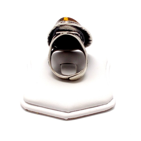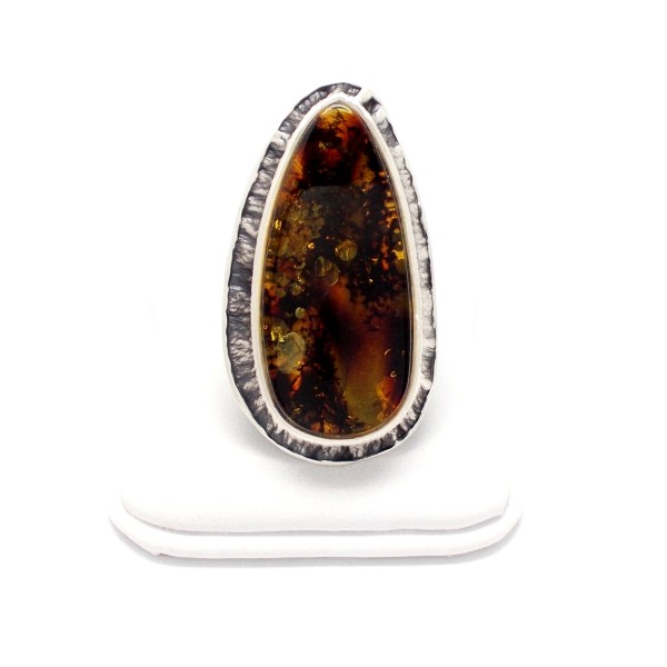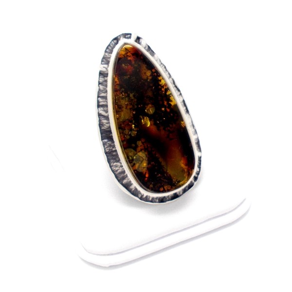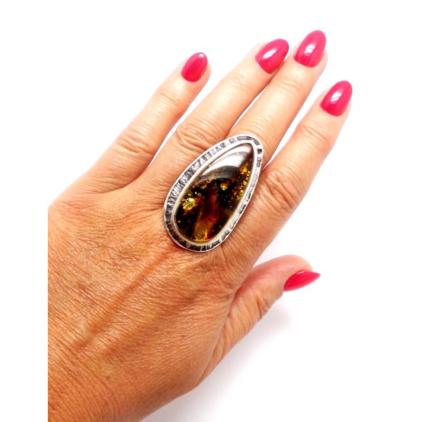 - Oryginalny, ręcznie wykonany pierścionek ze srebra oksydowanego próby 925 i bursztynu bałtyckiego. Wyrób jest ocechowany zgodnie z Ustawą Prawo Probiercze (DZ.U.nr 92poz. 529 z 2011r.). Długość bursztynu z oprawą 47 mm, szerokość 25 mm, rozmiar 14–24, regulowany, waga 15,88 g. Sprzedaży podlega pierścionek ze zdjęcia, niepowtarzalny, unikatowy. Do każdego wyrobu dołączany jest certyfikat. Każdy wyrób wysyłany jest w eleganckim, firmowym opakowaniu.